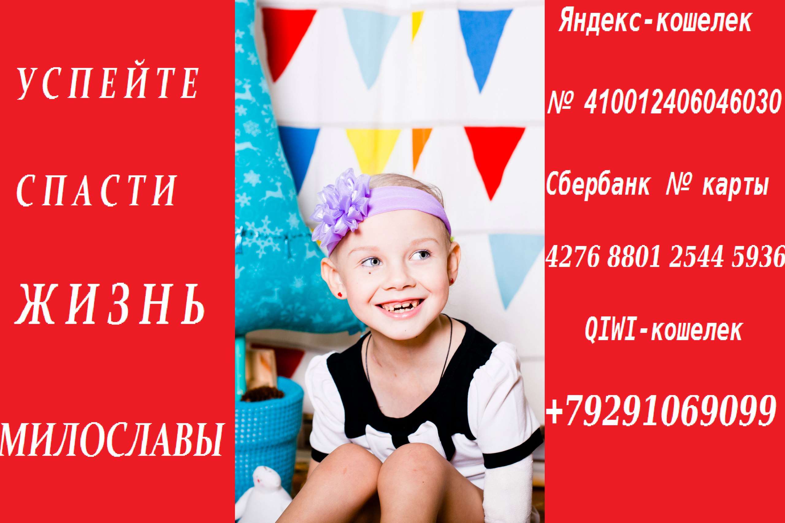 За 2 года Милослава прошла 9 курсов химиотерапии, операцию по удалению остаточной опухоли и пересадку костного мозга. Девочка героически борется с болезнью и не сдается. При первой же возможности все вокруг озаряется ее улыбкой.