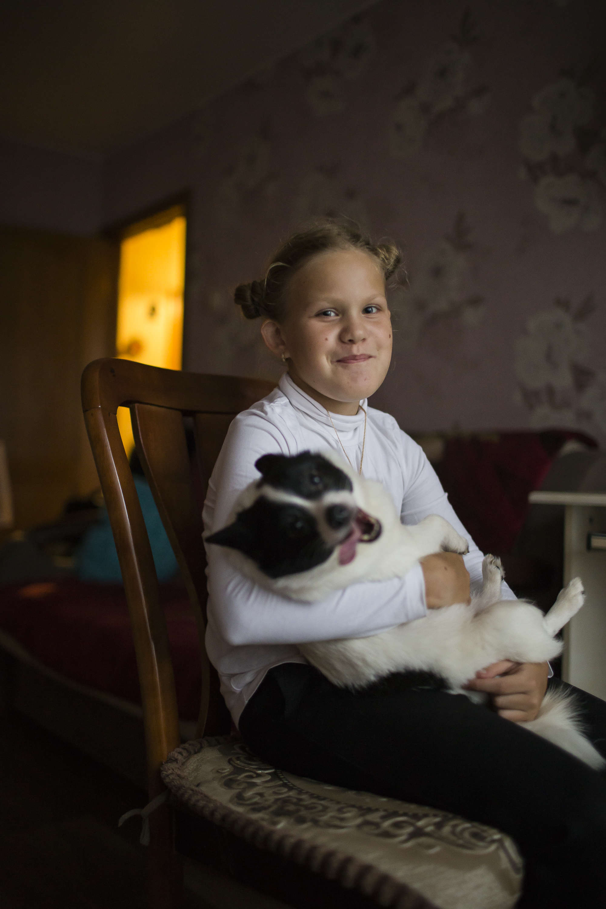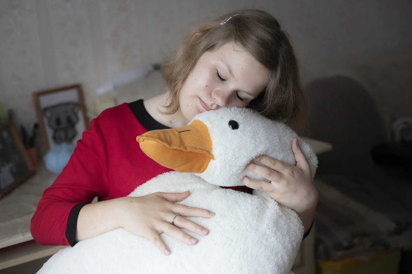 «Гусь появился три года назад. Он большой, можно обнимать, на нём даже можно спать. Сестрёнка иногда с ним засыпала. А я его ставлю к себе на колени, он меня согревает», — рассказывает Вика.