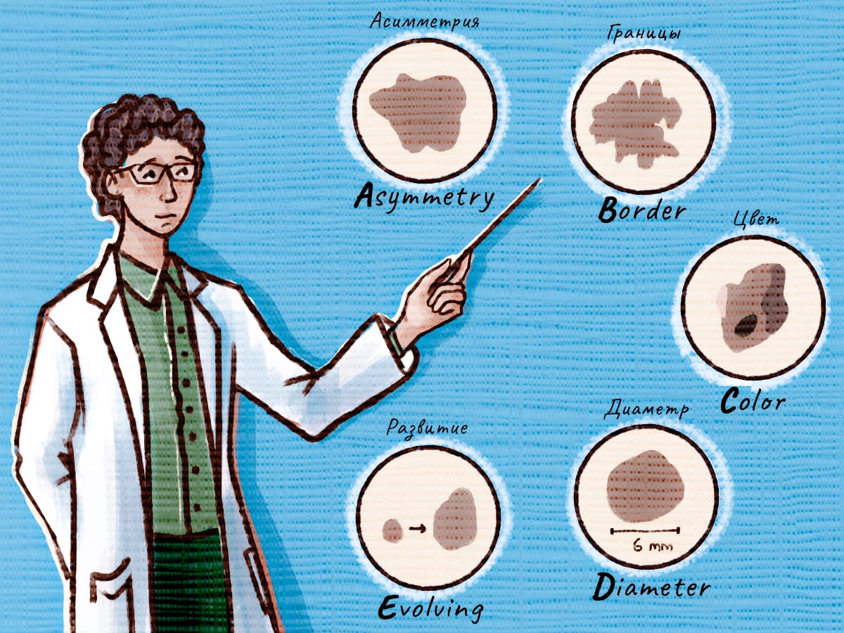 Профилактика меланомы — это регулярный самостоятельный осмотр всех частей тела. Врачи рекомендуют проводить самоосмотр в комнате с хорошим освещением, стоя перед зеркалом в полный рост. Для тех участков кожи, которые невозможно осмотреть самому стоит воспользоваться ручным зеркалом или обратиться за помощью к членам семьи. Во время самоосмотра каждого образования на теле можно использовать аббревиатуру, которую легко запомнить — ABCDE, где A (asymmetry) — это признак асимметрии: если мысленно поделить образование на коже на две половинки, то они не будут совпадать; B (border) — когда края образования неровные, зазубренные или размытые; С (color) — если цвет образования неравномерный, различных оттенков коричневого или серого цвета, иногда с включениями розовых, красноватых, белых или голубоватых пятен; D (diameter) — если диаметр пятна превышает шесть миллиметров, однако встречаются меланомы и меньшего размера; последний признак E (evolving) — изменчивость цвета или размера образования за последнее время. К признакам, которые должны насторожить стоит отнести и динамику самого образования: появление корочек, потерю кожного рисунка, глянцевый блеск, воспалительную реакцию вокруг. Существует и, так называемый, «симптом гадкого утенка»: когда все родинки на теле примерно одинаковой структуры, высоты, формы, размера и среди них есть та, которая выделяется. Таким образом, если во время самоосмотра новообразование на коже настораживает, кажется подозрительным, начинает чесаться, болеть или кровоточить, то стоит обратиться к специалисту по онкодерматологии.